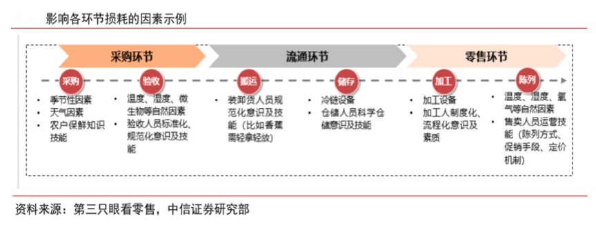 建立健全專業(yè)化的“生鮮供應(yīng)鏈”需要減少不必要的生鮮產(chǎn)業(yè)鏈損耗,提升生鮮美食的商品競爭力。根據(jù)第三只眼看零售、中信證券研究部等綜合資訊表明,采購環(huán)節(jié)、流通環(huán)節(jié)及零售環(huán)節(jié)等各生鮮產(chǎn)業(yè)鏈環(huán)節(jié)都存在一定的“生鮮損耗”,優(yōu)秀的生鮮零售品牌需要從上游商品化、中游市場化和下游品牌化“產(chǎn)業(yè)鏈整合”入手,提升區(qū)域內(nèi)網(wǎng)點(diǎn)密度以實(shí)現(xiàn)快速配送,提升“供應(yīng)鏈水平”強(qiáng)化產(chǎn)品豐富度、品質(zhì)、價(jià)格等,從整體上提升生鮮新零售平臺(tái)競爭力。