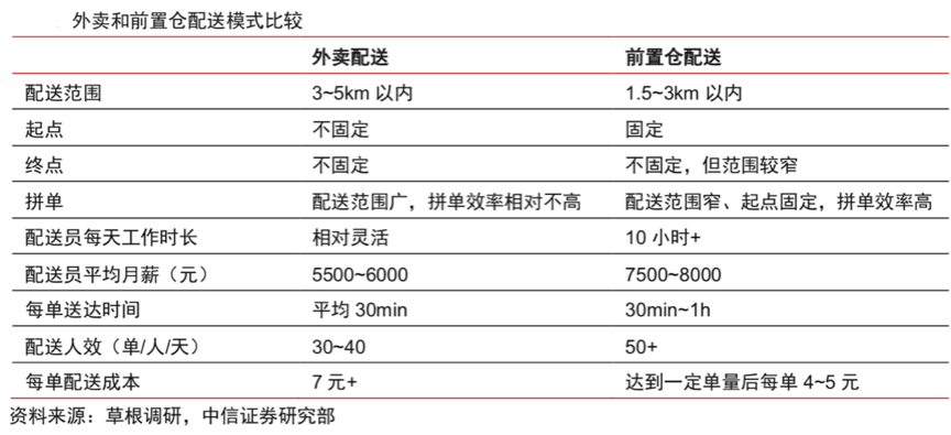 生鮮到家的配送效率是優(yōu)秀生鮮品牌致勝市場的重要一環(huán)。據(jù)草根調(diào)研、中信證券研究部等綜合資訊顯示,外賣和前置倉配送模式有所不同,外賣配送的范圍廣、區(qū)域大、快遞人員時(shí)間自由,這些決定了其配送效率有限及配送人效不高,而“前置倉配送”配送區(qū)域相對固定、配送范圍相對集中、訂單相對多樣,其配送人效比較高,也可極大提升配送的整體競爭力。