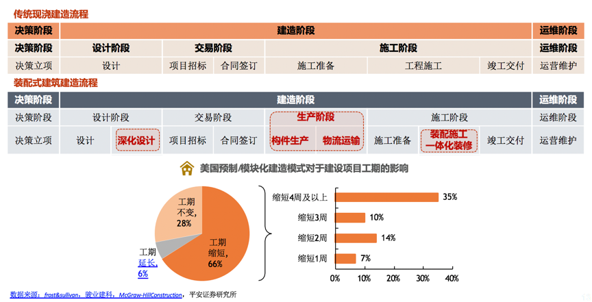 “輕鋼房屋”企業(yè)要想快速發(fā)展,就要充分發(fā)揮“輕鋼房屋”的優(yōu)勢,放大“輕鋼全屋”的亮點,激活“輕鋼房屋+輕鋼家裝”的商業(yè)價值。根據(jù)frost&fullivan、駿業(yè)建科、平安證券研究所等綜合資訊表明,相比于傳統(tǒng)的工程建造模式,“輕鋼房屋”通過在前期進行深化設(shè)計與標(biāo)準(zhǔn)化設(shè)計,將建筑物拆分為標(biāo)準(zhǔn)化部品部件,在工廠中提前批量生產(chǎn)部件部品,再運輸至工程現(xiàn)場進行組裝,從而縮短了現(xiàn)場建造周期(裝配式建造方法較傳統(tǒng)建造方式縮 短1/3以上工期)。并以前期定制化設(shè)計、構(gòu)件式生產(chǎn)和一體化裝修提高了“輕鋼房屋”的建造效率,提升了用戶房屋快速建、舒適家裝的體驗,這正是此品類的“一大特色”。