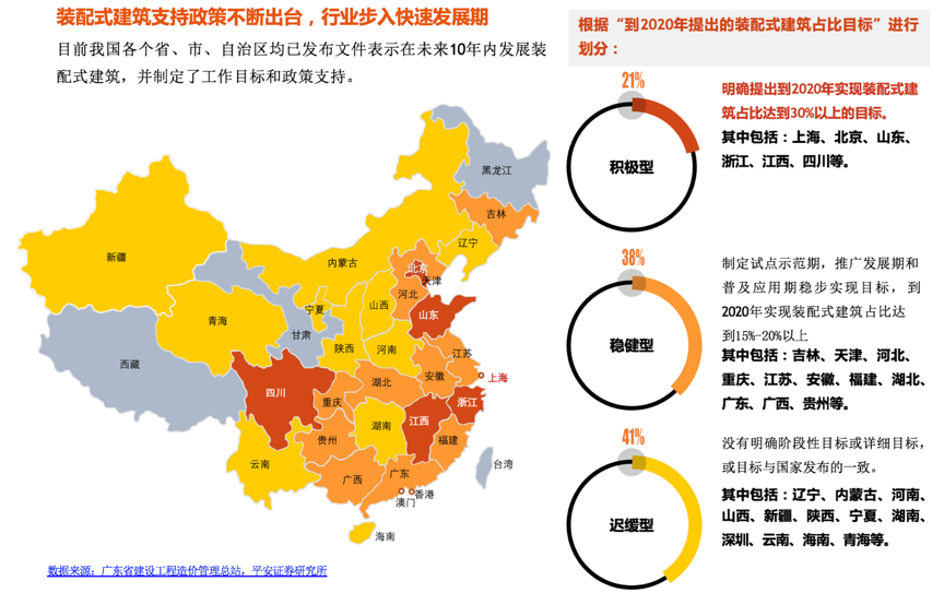 以“輕鋼房屋”為代表的裝配式建筑受到政策的極大鼓勵,各省市紛紛出臺了鼓勵政策,正可以推動“輕鋼房屋”在全國的快速擴張。根據(jù)廣東省建設(shè)工程造價管理總站、平安證券研究所等綜合資訊表明,目前,全國31個省份均發(fā)布了相關(guān)的激勵政策,新疆的激勵政策類型最多(8項),其次是四川省(6項)。全國政策激勵平均為4項,其中激勵政策條款數(shù)量靠前的省份依次是新疆、四川、黑龍江、河南、湖南、內(nèi)蒙古、江西、貴州、西藏等。