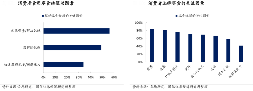 消費者食用零售更加關注營養健康、希望從中獲得愉悅感等,關注休閑食品消費的營養性和健康性,休閑食品不僅是為了充饑止餓,更是為了補充營養、提升能量等。根據吾德研究、國信證券經濟研究所等綜合資訊表明,驅動消費者食用零食的驅動因素是吸收營養/解決饑餓(56%)、獲得愉悅感(50%),而消費者選擇零食的關注因素是營養(84%)、健康(81%)、口味多樣性(75%)、新鮮(66%),營養和健康成為超80%的消費者選擇零食時的關注因素。