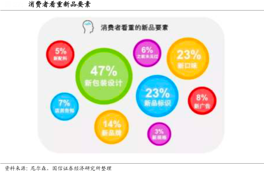 食品包裝策劃重在刷新產(chǎn)品包裝創(chuàng)意,關(guān)注新品標(biāo)識(shí)、新品牌及新價(jià)值,放大新產(chǎn)品、新創(chuàng)新和新包裝。根據(jù)尼爾森、國信證券經(jīng)濟(jì)研究所等研究資訊表明,47%的消費(fèi)者認(rèn)為創(chuàng)新包裝是吸引其目光的重要因素,23%的消費(fèi)者認(rèn)為新品標(biāo)識(shí)很重要,新品牌(14%)、新廣告(8%)等其次。