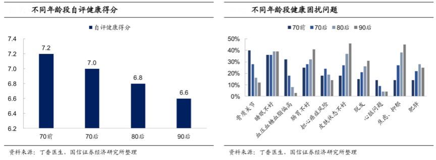 國內食品消費經過多年,消費升級使大家對食品更關注其品質化、價值化,國內消費主力人群集中在80后邊、90后人群,其對自身生活品質的要求促生了大量的“健康食品消費”,根據丁香醫生、國信證券經濟研究所等綜合資訊表明,80后、90后對骨質關節、睡眠、三高等健康問題尤其關心,更愿意為此支付費用。