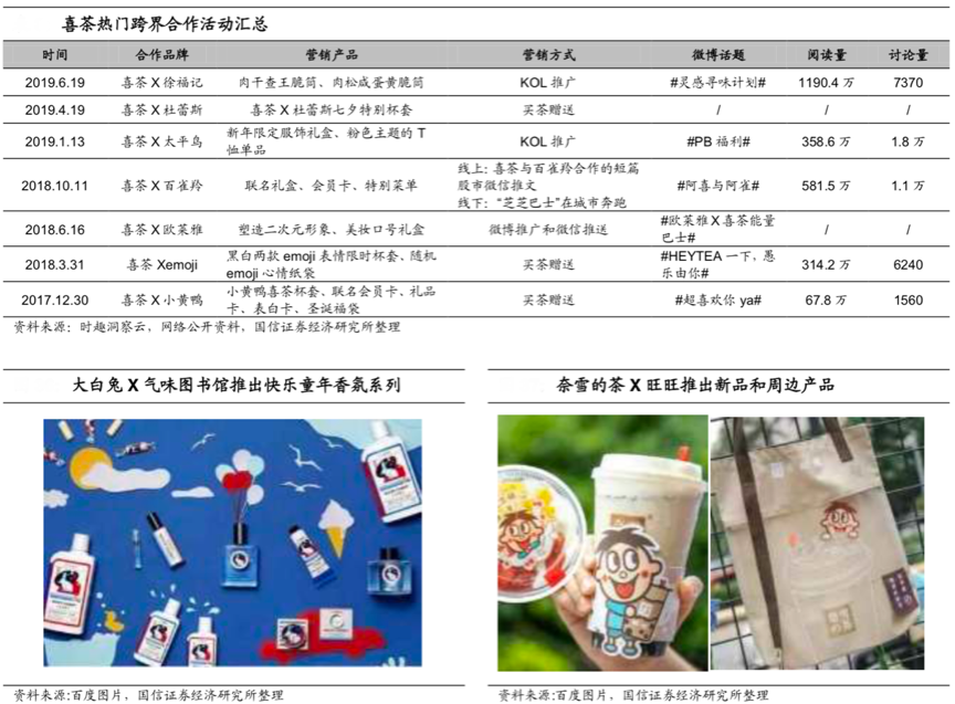 “聯合品牌營銷”近年來比較熱門,大量品牌紛紛聯合同檔次、同品質品牌開展“聯合活動”,以“跨界營銷”的方式放大自身的品牌能量,并強化多產品聯合促銷提升品牌影響力。根據時趣洞察云、網絡公開資料、國信證券研究所等綜合資訊表明,近年來大火的“喜茶”先后與小黃鴨、歐萊雅、太平鳥等知名品牌開展了跨界合作,小的活動多是買贈等活動,大的活動則是KOL推廣及定制單品等創新活動,活動大多引發用戶大量閱讀及討論,更有奈雪的茶、大白兔、鐘薛高等依托跨界營銷賺足眼球。