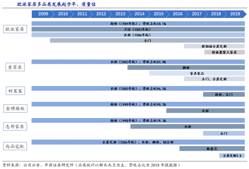 經典案例:根據公司公告、開源證券研究所等綜合資訊表明,歐派家居的多品類發展起步早、質量佳,已經形成了強大的“家居多品類矩陣”,形成了強大的“家居品類結構化競爭力”。2018年,歐派廚柜營收占比從 2011 年 的74%下降至 50%,衣柜營收占比從 20%上升至 36%,而其余定制家居品牌的營收仍主要集中于核心單品類,單品類營收占比基本在80%以上,歐派家居多品類發展起步早、質量佳。