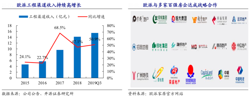 經典案例:根據公司公告、開源證券研究所、歐派家居官網等綜合資訊表明,2019 年前三季度,歐派公司大宗業務收入 15.5 億元,同比增長 50.8%,其已與萬科、綠城、恒大等多家國內知名百強房企建立了長期戰略合作關系。根據公司官網數據,地產百強企業中同歐派簽訂戰略合作協議的有 20 多家,長期合作的約有 70 多家。