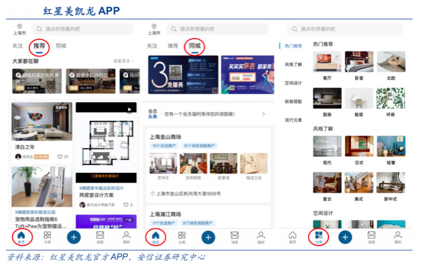 經(jīng)典案例:紅星美凱龍推出的官方終端 APP 已經(jīng)實(shí)現(xiàn)了“泛家居”網(wǎng)絡(luò)營(yíng)銷,推動(dòng)了門店數(shù)字化、會(huì)員數(shù)字化等前端數(shù)字營(yíng)銷的高效經(jīng)營(yíng),同步牽引數(shù)字運(yùn)營(yíng)管理等快速進(jìn)化。根據(jù)紅星美凱龍官方APP、安信證券研究中心等綜合資訊表明,其官方 終端 APP,主推家具建材、家居裝飾、家裝的內(nèi)容分享,還可提供同城商場(chǎng)詳細(xì)的樓層地圖及店鋪分布,為線下商城提供引流。“泛家居”內(nèi)容營(yíng)銷能夠相對(duì)提升用戶使用頻率,為線下店鋪引流。