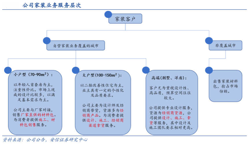 經(jīng)典案例:根據(jù)公司公告、安信證券研究中心等綜合資訊表明,紅星美凱龍的家裝服務(wù)精準(zhǔn)劃分客戶群,滿足消費(fèi)者相應(yīng)需求,主要以自營(yíng)的家裝服務(wù)來(lái)滿足客戶需求,公司采用設(shè)計(jì)師及工程隊(duì)包工頭為內(nèi)部人員,施工工人以外包形式獲得。目前公司家裝布局主要包括:提供全系列家裝服務(wù)的紅星·家倍得(成立于 2014 年)、紅星美凱龍網(wǎng)家裝平臺(tái)(成立于 2016 年),以及用于家裝設(shè)計(jì)的線上平臺(tái)——設(shè)計(jì)云。自 2019 年 下半年起,家裝業(yè)務(wù)進(jìn)入快速發(fā)展階段,全年(集中在下半年)家裝業(yè)務(wù)合 同金額近 32 億元,實(shí)現(xiàn)銷售及家裝收入 5.69 億元,家裝服務(wù)獲得了大發(fā)展。