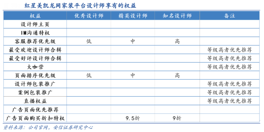經(jīng)典案例:根據(jù)公司官網(wǎng)、安信證券研究中心等綜合資訊表明,其推出了“設(shè)計(jì)家裝就一站”的紅星美凱龍網(wǎng)家裝平臺(tái),其主要針對(duì)都市新中產(chǎn)的家裝需求,為客戶提供設(shè)計(jì)、施工、監(jiān)理、選材、軟裝 等一條龍服務(wù)。平臺(tái)對(duì)入駐商戶進(jìn)行考核,根據(jù)設(shè)計(jì)師的等級(jí)配套相應(yīng)的優(yōu)先級(jí),包括客服推薦優(yōu)先級(jí)、頁(yè)面排序優(yōu)先級(jí)等。截至2018 年末,與公司的互聯(lián)網(wǎng)平臺(tái)簽約的高端家裝公司共計(jì) 2364 家,通過平臺(tái)預(yù)約裝修的客戶近 10 萬(wàn)人。