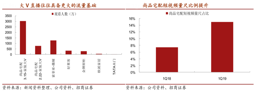 縱觀國內(nèi)家居新零售直播現(xiàn)狀,我們會發(fā)現(xiàn),企業(yè)級大 V 可通過短視頻、課堂類直播的形式與消費(fèi)者形成持續(xù)性互動,以專業(yè) IP 的形象獲得消費(fèi)都認(rèn)可,在家居直播中占據(jù)優(yōu)勢競爭地位。根據(jù)新聞資料整理、公司資料及招商證券等綜合資訊表明,大V直播具備更大的流量基礎(chǔ),尚品宅配2019年第1季度通過短視頻(含直播)的量尺占其線上量尺比例已超過15%,同比去年翻番。同時由于自主培養(yǎng)大 V 對企業(yè)的互聯(lián)網(wǎng)運(yùn)營能力要求更高,目前新居網(wǎng)MCN近乎壟斷了家居業(yè)頭部 IP 資源,家居直播競爭壓力加大。