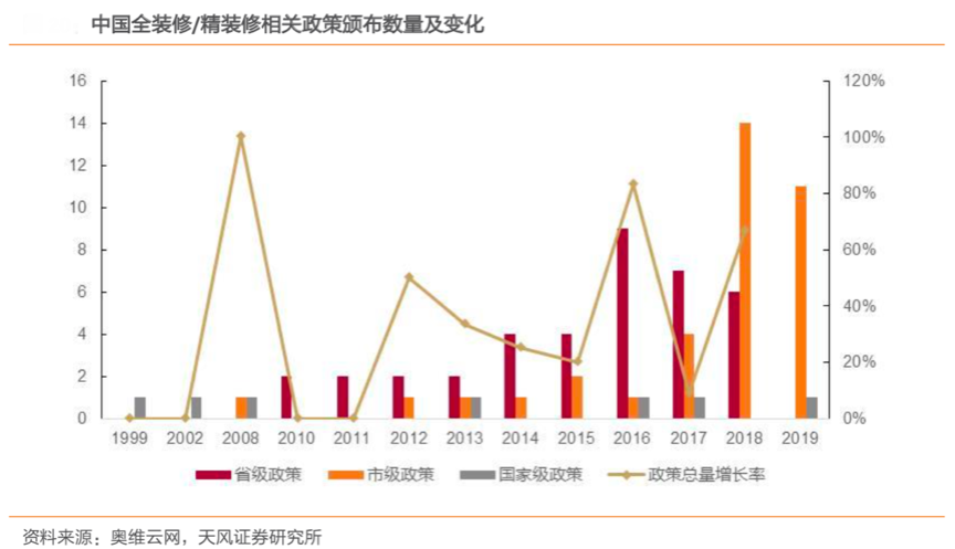 住宅精裝修政策引領著國內定制家居市場的持續增長,“精裝修”定制業務值得重點關注。根據奧維云網、天風證券研究所等綜合資訊表明,截至 2019 年 9 月, 全國累計頒布全裝修/精裝修的各類政策累計83次,覆蓋27個省市。2017年國家住建部印發的《建筑業發展“十三五”規劃》中明確提出,到2020年,新開工全裝修成品住宅面積達到30%,各地政府也出臺了相應的精裝修政策,明確提出等于或高于國家要求的精裝修滲透率。