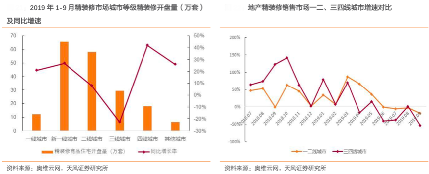 全屋定制家居的消費理念因區域不同而不同,一二線城市消費理念成熟,三四級下沉市場成為家居新零售企業成長的“業績產出地”,值得企業重兵投入。根據奧維云網、天風證券研究所等綜合資訊表明,精裝政策一二線城市先行,一、二線城市精裝滲透率較高。一、二線城市占全國 28%的銷售面積以及全國 72%的精裝修面積,三四線城市尚有較大滲透空間。2017年以來,大量布局在三、四線城市的房企銷售面積高速增長,帶動精裝市場下沉,2018 年下半年以來三四線及一二線城市銷售面積增速下行,但整體三四線商品房市場規模依舊較大。