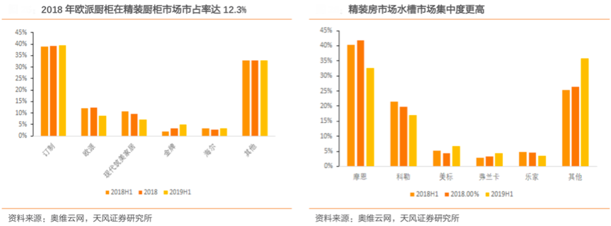 精裝修的家居消費理念指引下,大量的家居企業會放大自己的品牌號召力,強化核心品類的自主品牌影響力,從而形成對家居消費用戶的強大品牌號召力。根據 奧維云網、天風證券研究所等綜合資訊表明,2018年歐派、現代筑美家居占精裝廚柜市場的市占率分別為12.3%、9.5%,顯著高于兩家企業在零售市場的市占率。而從水槽市場的數據驗證來看,摩恩、科勒占精裝水槽市場的市占率分別為 41.74%、19.74%,強大的優勢品類品牌在“全屋定制”的消費競爭中占據有利地位,品牌影響力更大,品類決策的號召力更大。