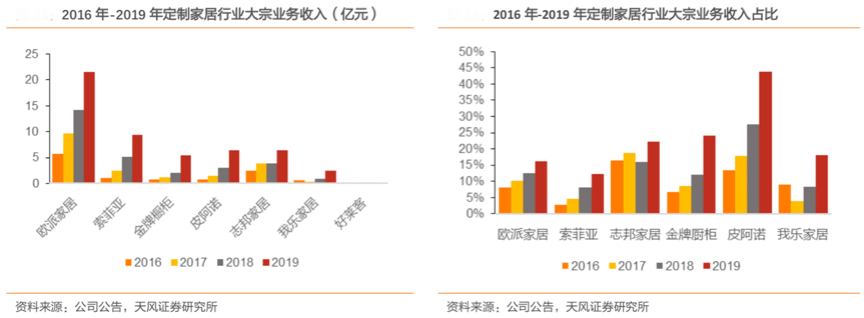 同時,有一個現象值得關注,以地產商、工程商等為對象的“大宗商品交易”,往往是優秀的家居品牌更占競爭優勢,其品牌形象突出,合作相對穩定,對客戶的品質保證、服務保證等更高,品牌與商業合作伙伴的黏度也更高。根據公司公告、天風證券研究所等綜合資訊表明,2016年-2019年定制家居行業大宗業務收中,歐派家居、索菲亞、金牌櫥柜、皮阿諾等知名家居品牌收入占比高,在定制家居行業大宗業務中占據有利市場地位。