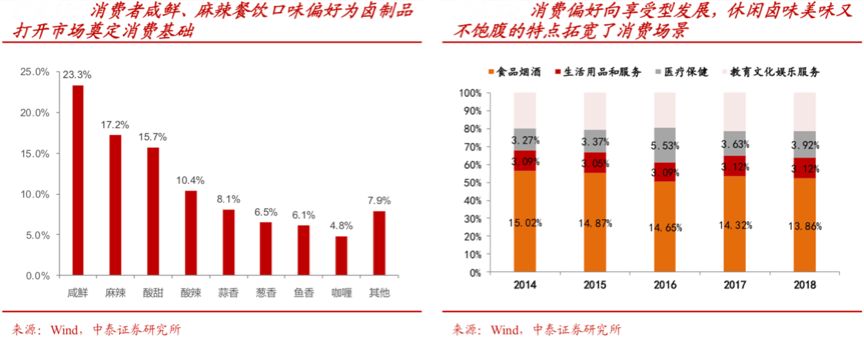 隨著食品消費偏好向享受型發展,休閑鹵味美味又不飽腹的特點拓寬了食品消費的“大場景”,從餐桌佐菜到社交零食,食品消費頻次有望隨著品質型消費升級而陸續提升,根據wind、中泰證券研究所等綜合資訊顯示,消費者的口味關注度比較高,對食品消費的影響力比較大,以鹵制品行業為例,消費者咸鮮、麻辣餐飲口味偏好為鹵制品,這就為其打開市場奠定了消費基礎。