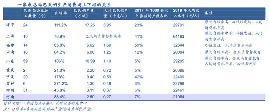 從區域乳品企業的經營現狀來看,區域乳品企業大多久經激烈的市場競爭考驗,紛紛搶占奶源基地,強化奶源、強化冷鏈基地建設等是各區域乳品企業極為關注的競爭力所在。根據《中國奶業年鑒》、安信證券研究中心等綜合資訊表明,區域乳品企業的“奶源競爭優勢”比較突出,“當地奶源”往往成為區域乳業參與的市場競爭的“成功關鍵要素”,遼寧、山東等地原奶自給率高于100%,而云南是西南地區原奶自給率最高的省份,其巴氏奶消費量亦較高;冷鏈物流發達是華東(江浙滬、福建等)、華北地區(山東等)等地巴氏奶消費量較高的主要因素之一。