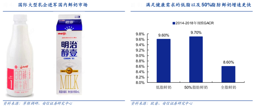 從消費人群來看,90后、95后已經成為乳品消費的主力人群,對乳品產品的年輕化、時尚化等提出了更高要求,大部分年輕消費者對食品的健康性、主題性等比較關注,產品消費的健康化、品質化和個性化已經成為乳品主力消費人群的“核心消費關注點”之一。根據歐睿、安信證券研究中心等綜合資訊表明,滿足健康需求的低脂以及50%脂肪鮮奶增速更快,這些富含健康元素的乳品無益更受歡迎。