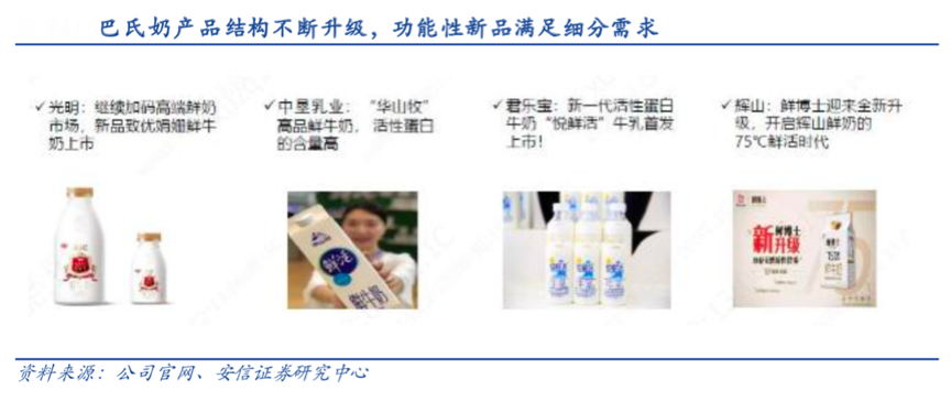 消費升級驅動著乳品產品結構持續升級,功能性新品滿足細分需求,乳品的多功能性、健康性等日益明顯。根據光明官網、安信證券研究中心等綜合資訊表明,乳品巴氏奶產品結構不斷升級,2019年光明的高端鮮奶系列優倍、致優增 速 20%、50%以上,2019年推出超高端娟珊系列,蛋白質含量 3.8g/100ml;新希望推出24小時鮮牛乳,開啟72°C巴氏殺菌時代。