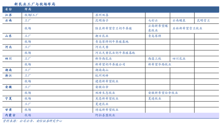 乳品企業發展至今,多數企業已經完成了“規模化成長”,從銷售規模的擴張向“資本驅動成長”發展,企業的規模化發展更具實力。根據公司公告、安信證券研究中心等綜合資訊表明,新希望乳業于2002年開啟并購整合之路,2015-2016年先后并購昆明海子、湖南南山、蘇州雙喜、朝日乳業,布局云南、湖南、華東、華北市場,通過“1+ N”模式打破低溫鮮奶的區域屬性、不斷并購整合做強做細區域性乳制品市場,同時逐漸拓展出布局全國的的乳制品產業鏈。
