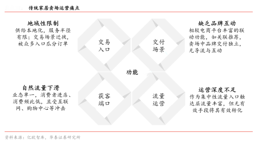 家居賣場有自己的運(yùn)營痛點(diǎn),有些“運(yùn)營痛點(diǎn)”還比較痛,值得家居賣場新零售電商經(jīng)營者深度洞察、創(chuàng)新解決。根據(jù)億歐智庫、華泰證券研究所等綜合資訊表明,傳統(tǒng)家居賣場運(yùn)營痛點(diǎn)主要集中在地域、流量、品牌互動(dòng)及運(yùn)營深度等方面,其核心原因在于傳統(tǒng)的家居賣場依然是以“家居產(chǎn)品銷售及部分服務(wù)”為盈利模式的,以“家居賣場”流量運(yùn)營為核心驅(qū)動(dòng)力的,商業(yè)模式相對滯后,無法適應(yīng)數(shù)字化技術(shù)驅(qū)動(dòng)下的新家居、新零售和新商業(yè)的深度變革。