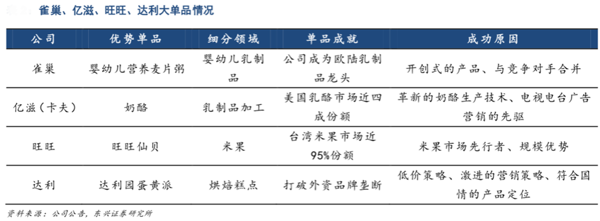 休閑食品的消費世代正在更迭,90后、95后已經成為行業性消費主力,有互聯網情趣的產品、有高價值互動的品牌活動,有年輕活力感的創意產品,更受休閑食品消費者的歡迎,各大休閑食品品牌紛紛推廣“品牌大單品”,旨在以“大單品”亮化休閑食品的消費 訴求,激活產品的消費量。根據公司公告、東興證券研究所等綜合資訊表明,以雀巢、億滋等大單品層出,其大多依賴于其強大的品牌營銷策劃創新、產品創新突破等,同時依托大單品建立了一系列的“高效休閑食品組合”,刷新了充饑、休閑、娛樂、玩趣等多種休閑食品消費場景。