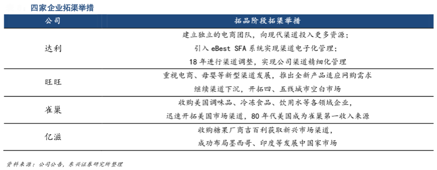 深耕渠道是拓品戰略成功的重要保障,建立健全線上交易、門店體驗等全渠道銷售場景是各公司迅猛崛起的重要保障。根據各公司公告及東興證券研究所等綜合資訊表明,國內企業在拓品過程中,主要依靠擴大營銷網絡和加強渠道下沉來維持自身的渠道優勢,國外食飲龍頭則通過并購在拓品的同時快速實現拓渠。