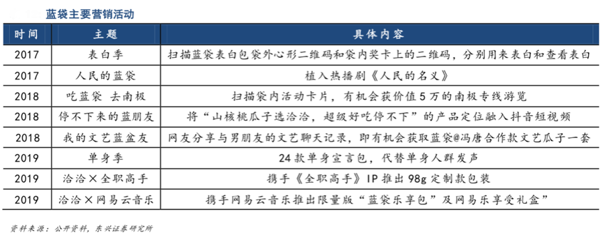 點燃用戶的品牌互動熱情,放大品牌的消費能量,這是各企業提升品牌競爭力的“不二法寶”。優秀的品牌總是從單一產品的價值放大開始,強化多產品的“休閑及趣味價值塑造“,細化堅果炒貨產品賣點,點亮消費場景,放大產品原料特色,以年輕化包裝、多口味創新及新穎時尚的營銷活動全面彰顯品牌價值。根據公司公開資料、東興證券研究所等綜合資訊表明,洽洽食品通過藍袋產品一系列主題活動設計,亮化藍袋的二維碼引流設計,植入《人民的名義》等各項特色,由此亮化品牌形象,贏得了用戶的一致贊許。