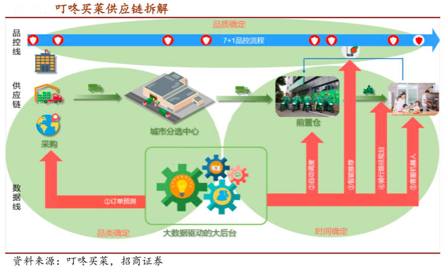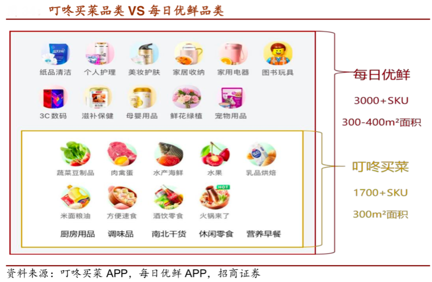 經典案例:據招商證券等資訊表明,叮咚專注經營“大廚房場景”下的生鮮品類,通過自建分揀倉,提高蔬菜毛利,直接在“賣菜”上賺錢。可以實現水產生鮮鮮活到家,與其他競品形成差異化競爭,將SKU嚴控在 1700+,生鮮占比高達75%-80%,倉內揀貨效率更高,加速商品周轉。
