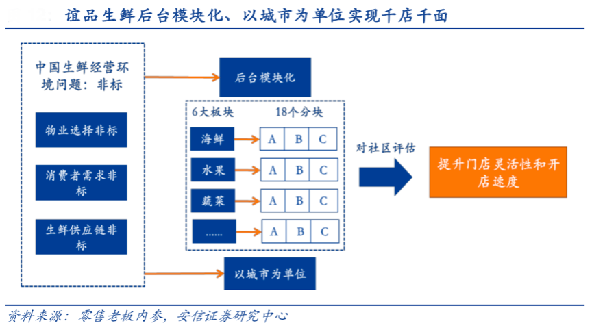 經(jīng)典案例:據(jù)零售老板內(nèi)參、安信證券研究中心等綜合資訊表明,誼品生鮮市場(chǎng)拓展大多會(huì)以城市為單位,在一個(gè)城市就做好每個(gè)家庭,以社區(qū)為落腳點(diǎn)。最終,將難以標(biāo)準(zhǔn)化的生鮮商品納入到標(biāo)準(zhǔn)化的流程中,增加了門店收入,為快速開(kāi)店打下基礎(chǔ)并實(shí)現(xiàn)“千店千面”。