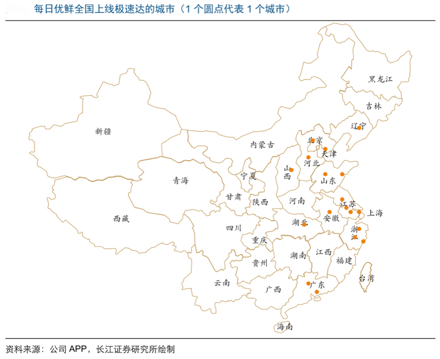 同時,其根據(jù)前置倉普遍面積相對較小、租金成本相對偏低,選址的靈活性也相對更高, 理論上能夠以較快速度、實現(xiàn)對城市更為全面的覆蓋,加之后期開放了前置倉加盟,每日優(yōu)鮮自上線以來極速達覆蓋城市已達到 17 個,城市復制擴張速度較快。