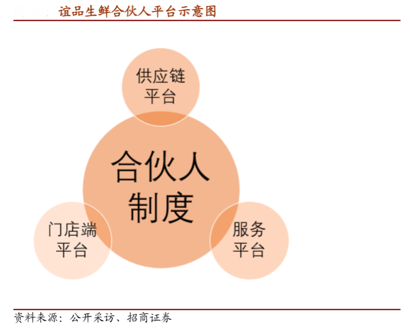 經典案例:據公開采訪、招商證券等綜合資訊表明,在門店端的合伙人方面,誼品生鮮門店員工以自有資金和公司合資開店,最后按利潤進行分紅。而合伙人出資金額與自身能力相關。通常,一家誼品生鮮門店店長投入 10-40 萬元不等,副店長、小店長投入 2-10 萬元不等。但是出資比例一般不會超過單店的 40%,同時合伙人享有的是分紅權而不是股權。