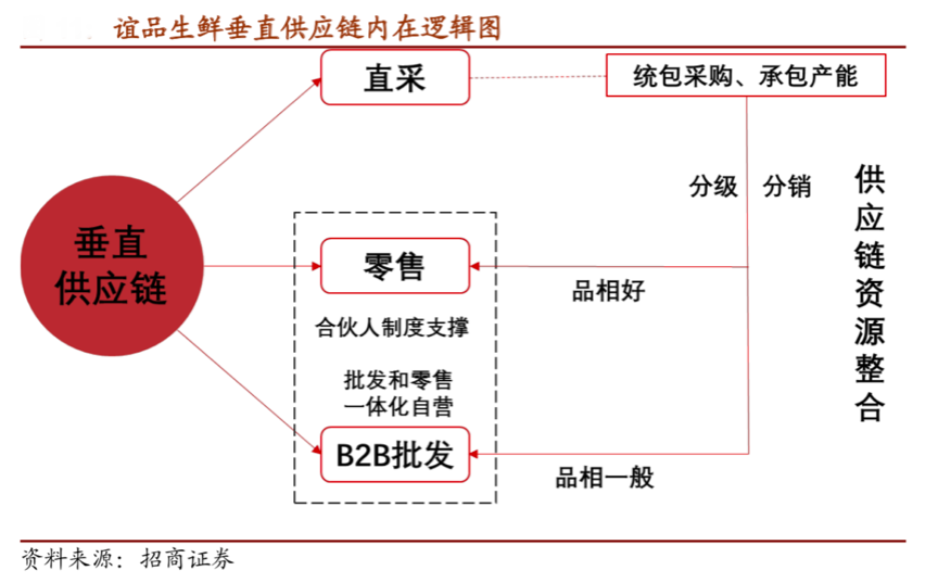 經典案例:據招商證券等綜合資訊表明,誼品生鮮的直采則是從產地完成統包采購,然后在批發端完成分銷,針對不同的分級和標準,分銷到不同的渠道中,真正地做到了供應鏈的資源整合,實現品相好的放到門店內賣,其它則通過B2B 批發業務分銷。