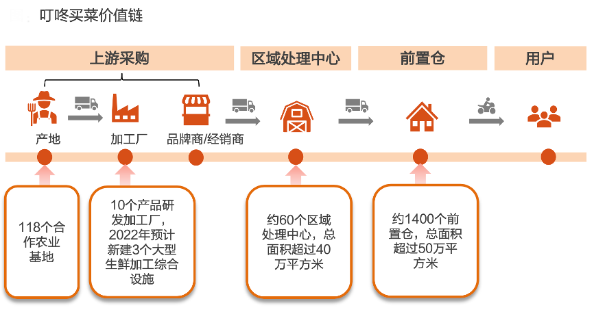 經典案例:根據叮咚買菜2021Q4業績會PPT、東方網、天風證券研究所(數據截至2021年12月31日)等綜合資訊表明,叮咚買菜價值鏈主要包括上游采購、區域處理中心、前置倉、用戶四大組成部分。其中上游采購包括產地直采、自有品牌加工、品牌商/經銷商采購三種方式。