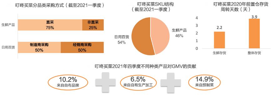 經典案例:根據叮咚買菜招股書、叮咚買菜2021Q4業績會PPT、天風證券研究所等綜合資訊表明,叮咚買菜產品結構不斷優化,自有品牌、自有生產加工產品、預制菜比重上升。2021年四季度,自有生產加工產品在GMV中占比6.5%,預制菜在GMV中占比14.9%。