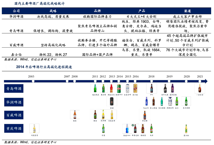 經(jīng)典案例:根據(jù)wind、信達(dá)證券研發(fā)中心等綜合資訊表明,在國(guó)內(nèi)啤酒銷量接近飽和、消費(fèi)者對(duì)高品質(zhì)產(chǎn)品的訴求下,國(guó)內(nèi)啤酒廠業(yè)務(wù)重點(diǎn)逐漸轉(zhuǎn)向中高端市場(chǎng)并加大資源傾斜力度。2013年嘉士伯集團(tuán)入主重啤后整合產(chǎn)能,2018年加快產(chǎn)品結(jié)構(gòu)升級(jí),將嘉士伯、樂堡、凱旋 1664 等國(guó)際高端品牌導(dǎo)入重慶啤酒的銷售體系。2018 年潤(rùn)啤提出“決戰(zhàn)高端、質(zhì)量發(fā)展”戰(zhàn)略,與喜力達(dá)成長(zhǎng)期戰(zhàn)略合作協(xié)議,推出SuperX、匠心營(yíng)造兩款高端產(chǎn)品,2019年推出馬爾斯綠、黑獅白啤、喜力經(jīng)典。
