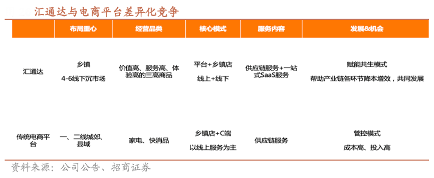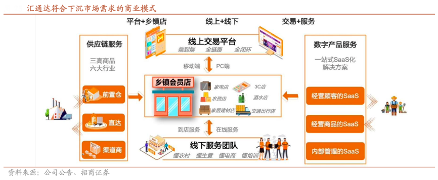 經(jīng)典案例:根據(jù)公司公告、招商證券等綜合資訊表明,匯通達(dá)布局鄉(xiāng)鎮(zhèn)市場(chǎng),主要經(jīng)營(yíng)三高類商品, 并通過線上+線下相結(jié)合的方式對(duì)供應(yīng)鏈及 SaaS 產(chǎn)品賦能,向會(huì)員零售門店提供服務(wù),僅有 To B 業(yè)務(wù),利用公司近 3000 人的線下專業(yè)團(tuán)隊(duì)針對(duì)下沉市場(chǎng)零售門店痛點(diǎn)制定解決方案,與國(guó)家?guī)头鑫⑿∑髽I(yè)、鄉(xiāng)村振興導(dǎo)向相同。