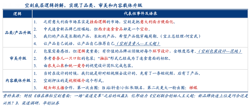 經(jīng)典案例:根據(jù)財(cái)經(jīng)《誰在捧紅捧紅空刻意面:一場“渠道變革”之后的雙贏》、億邦動力《空刻聯(lián)合創(chuàng)始人王義超:新品牌快速上位是巧合還是必然?》、渠道調(diào)研、華創(chuàng)證券等綜合資訊表明,空刻公司首先與超頭部主播合作直播,實(shí)現(xiàn) 第一次出圈,初步形成品牌印象和嘗試購買。同時其合作黃圣依/鐘麗緹/戚薇等自帶家庭屬性明星,同時和寶馬、安佳等聯(lián)名,進(jìn)行戶外、梯媒和網(wǎng)劇植入,七夕承包杭州 LED 屏,都是更大一輪品牌破圈和更高品牌聲量。