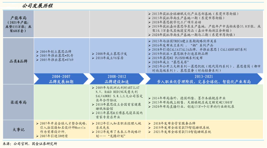 經典案例:根據公司官網、國金證券研究所等綜合資訊表明,慕思公司2013 年開始步入職業化管理階段,品牌、產能、渠道布局持續完善,全球化、智能化布局也正推進。