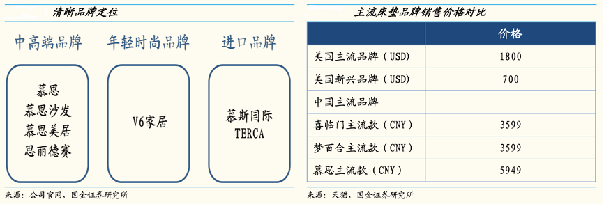 經典案例:根據公司官網、天貓、國金證券研究所等綜合資訊表明,慕思公司主品牌慕思整體定位中高端,依托子品牌搶占其余細分市場。大眾市場方面,公司依托 V6 品牌進行布局,而高端市場分別用 TERCA、思麗德賽等進口 品牌進行布局。