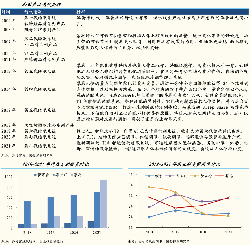 經典案例:根據公司官網、公司招股說明書、國金證券研究所等綜合資訊表明,慕斯公司通過推行端到端的 IPD 集成產品開發模式,縮短開發周期和提升新品上市率,提升產品迭代速度。其將人體工程學、睡眠環境學、智能化技術融入到產品設計中,通過軟件、硬件不斷升級,先后發布第一到第八代健康睡眠系統,且從最開始的 2-5 年迭代一次到近三年每年迭代一次。