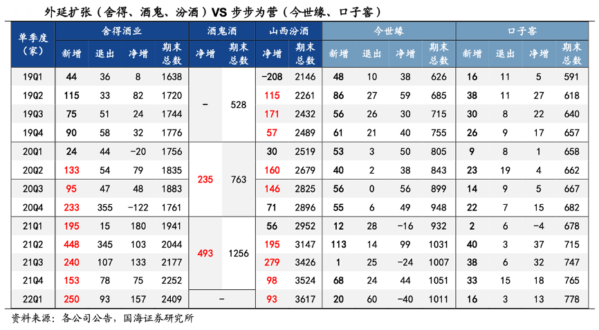 經典案例:根據各公司公告、國海證券研究所等綜合資訊表明,對比舍得酒鬼和今世緣口子近年來經銷商數量變化,可以發現三線次高端是通過短期招商鋪貨在低基數基礎上實現波段式增長,而區域龍頭的經銷商數量穩定小幅擴張,業績則是穩扎穩打的持續穩健增長。