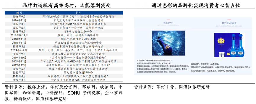 經典案例:根據搜狐上海、洋河股份官網、環球網、映象網、中國軍網、和訊新聞、中新經緯、SOHU營銷觀察、企業家日報、糖酒快訊、洋河1號、國海證券研究所等綜合資訊表明,洋河公司前期通過營銷已經順利完成“藍色經典”、“夢之藍”的品牌全國化,通過色彩營銷完成 “占位”,把藍色與公司品牌畫上等號,更以“雙名酒”形成難以超越的形象財富。