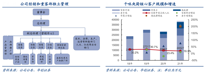 經典案例:根據公司公告、華創證券等綜合資訊表明,千味央廚成立對接大客戶的內部小組,董事長和總經理為小組負責人,營銷部門單獨設立重客部,確??焖夙憫罂蛻舻男枨?,在具體開發過程中,公司梳理各餐飲消費場景的頭部客戶,自上而下從 TOP3 向 TOP10 拓展新客戶,并成立包括市場、研發、商務等專項小組,由專項組與客戶溝通定向解決問題,如千味憑借產品質量與成本控制,同 KFC 合作30個SKU,油條、撻皮供應份額分別高達100%、80%。