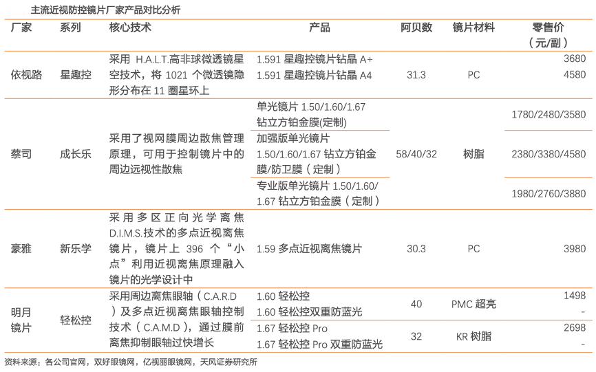 經典案例:根據各公司官網、雙好眼鏡網、億視麗眼鏡網、天風證券研究所等綜合資訊表明,由于目前消費者對近視防控鏡片產品的認知較為有限,近視防控鏡片當前尚處于品類發展初期,各品牌紛紛布局有利于共同完成消費者教育、培育市場,公司產品有望借助終端渠道布局、憑借性價比優勢進一步提升市場份額。