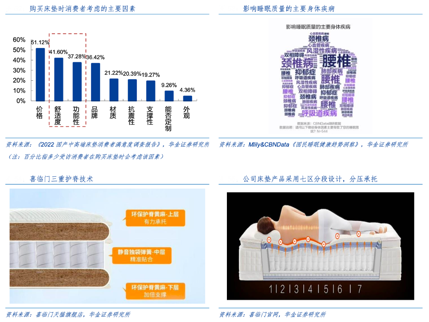 經(jīng)典案例:根據(jù)《2022國(guó)產(chǎn)中高端床墊消費(fèi)者滿(mǎn)意度調(diào)查報(bào)告》、Mlily&CBNData《國(guó)民睡眠健康趨勢(shì)洞察》、喜臨門(mén)天貓旗艦店、喜臨門(mén)官網(wǎng)、華金證券研究所等綜合資訊表明,喜臨門(mén)自 2013 年起,連續(xù)十年發(fā)布《喜臨門(mén)睡眠指數(shù)報(bào)告》,構(gòu)建以中國(guó)人睡眠狀況 為研究對(duì)象的專(zhuān)業(yè)指標(biāo)體系,堅(jiān)持國(guó)人睡眠研究和消費(fèi)者洞察。公司床墊產(chǎn)品以“保護(hù)脊椎”為核心功能訴求,不斷深化“保護(hù)脊椎”和“深度好睡眠”的品牌定位,喜臨門(mén)護(hù)脊床墊產(chǎn)品榮獲香港脊醫(yī)協(xié)會(huì)認(rèn)證,“護(hù)脊之星”等榮譽(yù)。