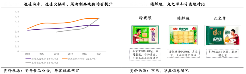 同時中高價產品正向拉動企業利潤,公司速 凍米面、速凍火鍋料噸價已分別由 2016 年 0.85/0.92 萬元/噸提升至2021 年 1. 04/1.33 萬元/噸。