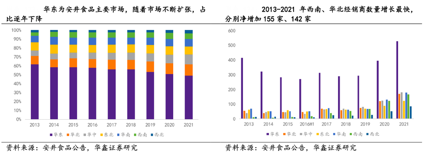 經典案例:根據安井食品公告、華鑫證券研究等綜合資訊表明,安井食品公司以華東為中心,逐步開拓東北、華南、西南、西北等非強勢區域,構建高密度銷售網絡。2013-2021年其西南、華北經銷商數量增長最快,分別凈增加155家、142家。