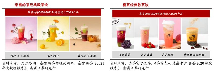 經典案例:根據灼識咨詢、奈雪的茶招股說明書、奈雪的茶《2021年大數據報告》、喜茶官方微博、《茶勢喜人靈感永駐 喜茶2020年度報告》、浙商證券研究所等綜合資訊表明,以喜茶、奈雪的茶為例,兩者的經典款產品銷量均穩定靠前,表現出較長的生命力,其中霸氣芝士草莓、霸氣橙子、霸氣芝士葡萄作為奈雪 2020-2021 年的三大暢銷經典茶飲,2020 年售出超過 2180 萬杯,占現制茶飲總銷售額的27.6%。