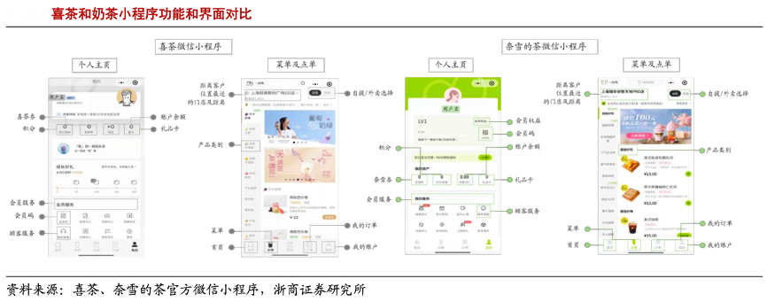 經典案例:根據喜茶、奈雪的茶官方微信小程序、浙商證券研究所等綜合資訊表明,截至 2021 年 6 月 30 日止三個月內,奈雪的茶活躍會員總數約 7.4 百萬,活躍會員復購率約為 30.3%。新茶飲企業正在通過微信小程序、自有 App 等,提供如預點單、幾份換禮 品、專屬評價渠道等,匯聚消費者的訂單信息和意見反饋,從客戶需求出發優化產品和服務,加強與消費者之間的連接。