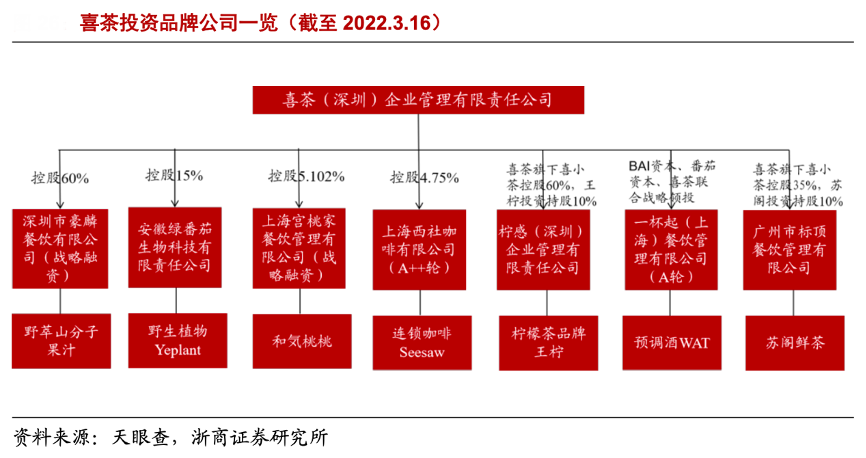 經(jīng)典案例:根據(jù)天眼查、浙商證券研究所等綜合資訊表明,結(jié)合喜茶 GO 小程序,喜茶已布局咖啡、雪糕、甜點烘焙多條產(chǎn)品線,據(jù)天眼查數(shù)據(jù),2021 年 7 月以來,喜茶投資了包括精品咖啡Seesaw、檸檬茶品牌王檸、水果茶品牌和気桃桃、果汁品牌野萃山、燕麥奶品牌野生植物 YePlant、預(yù)調(diào)酒品牌 WAT 共 6 個品牌,2022 年喜茶又投資了中端價位主打水果茶的蘇閣鮮茶,產(chǎn)品線持續(xù)拓展。